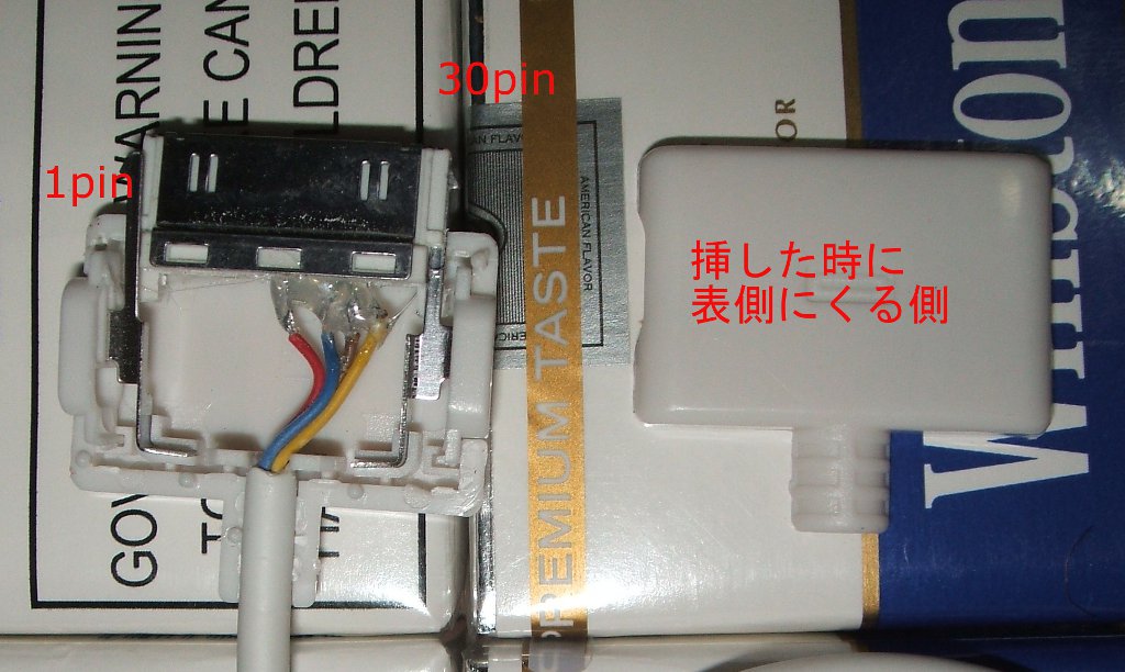 接着剤を取ると、ケーブルに半田付けされたピンがプラスチックのハウジングから抜けるようになります。 赤い線がついているものから一本ずつ手前に引いて抜き、次の場所に移動してください。 ピン配列は上記写真の状態で、一番左が1pin、一番右が30pinです。
