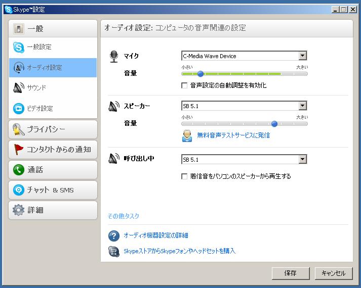 Skypeでは上記X-Liteとは逆に、スピーカーと呼び出し音にはSB 5.1 を割り当て、マイクにはC-Media Wave Deviceを割り当てています。 X-Liteで再生される音(C-Media Wave Deviceのスピーカー出力)はSkypeに入力されるようになります。